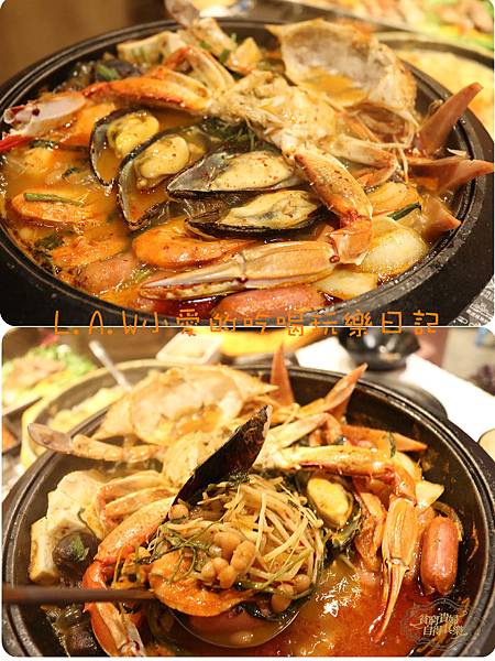 一整鍋滿滿的青菜,還有淡菜蝦子,當然還有部隊鍋不可或缺的火腿午餐肉。